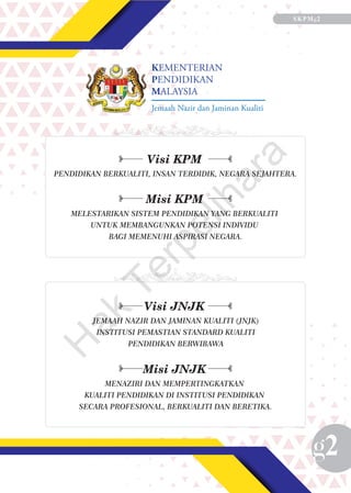 Standard Kualiti Pendidikan Malaysia Gelombang 2 SKPMG2 telah diperkenalkan oleh Kementerian Pendidikan Malaysia KPM bagi meningkatkan keberkesanan pengurusan dan proses penyampaian pendidikan. Mengetuai penyediaan garis panduanformat perancangan strategik merangka strategi pencapaian sasaran memantau dan menyiapkan dokumen perancangan strategik dengan mekanisme yang sesuai mengikut ketetapan hala tuju keperluan sekolah dan secara komprehensif. SKPMg213FEBRUARI2017 2 SKPMg213FEBRUARI2017 ASPEK 11.